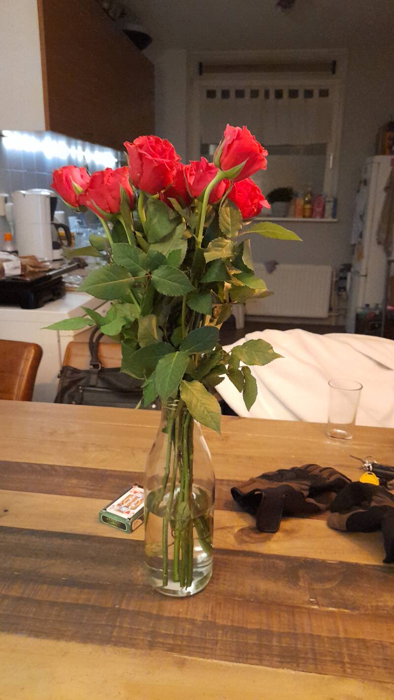 Vanuit de bus zagen we dat de buren mensen aan de deur hadden. Toen we langsliepen dachten we al dat het mogelijk onze nieuwe buren zouden zijn. Buurvrouw was in de deuropening aan het praten met het jonge stel en had een bosje bloemen in haar hand. Toen we binnenkwamen stond er ook een bosje rozen bij ons op tafel. Oudste zoon bevestigde ons vermoeden en zei dat hij net kennis had gemaakt met onze nieuwe buren.....BIJ ONS BINNEN! Zoon! Heb je gezien hoe het er hier eruit ziet?? AAAARRGH!! Hij vertelde dat hij de buren wel had gezegd: 'let niet op de rommel'. Maar al met al hebben ze iets van 10 minuten bij ons op de bank gezeten (wonderbaarlijk gedroeg de hond zich goed), en hadden begrip voor onze rommel. Ze zeiden namelijk dat het bij hen ook waarschijnlijk de eerste paar weken een rommeltje zal zijn aangezien ze alles nog moeten inrichten. De eerste paar weken.....Beste buren, het is hier al 18 jaar een rommeltje! Maar goed, ze krijgen deze week de sleutel. Ben benieuwd!